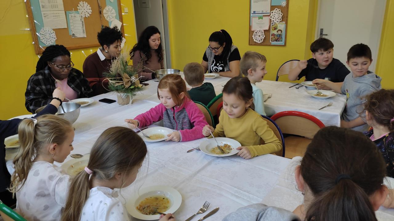 Měly pro děti připravené moc pěkné prezentace jejich zemí. Děti pochopitelně nejvíc zaujala zvířata, tradiční pokrmy, to že slečna z Ugandy má 14 sourozenců a skutečnost, že v Brazílii tráví Vánoce u bazénu, neboť tam právě mají léto. Společně jsme pak poobědvali - byla svíčková. Už vloni se beseda se zahraničními studenty setkala u dětí s velkým ohlasem a letos tomu nebylo jinak. Tak zase napřesrok!