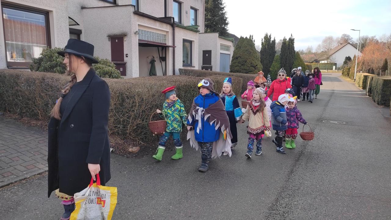 Poslední únorový den vyrazila naše školka a škola na tradiční masopustní průvod. Letos byl poznamenaný chřipkovou epidemií. Počasí nám ale přálo a veselé masky a zpěv byly odměněny bohatou koledou, děkujeme! Někteří, kterým nemoc nedovolila se zúčastnit, nám alespoň zamávali z oken.